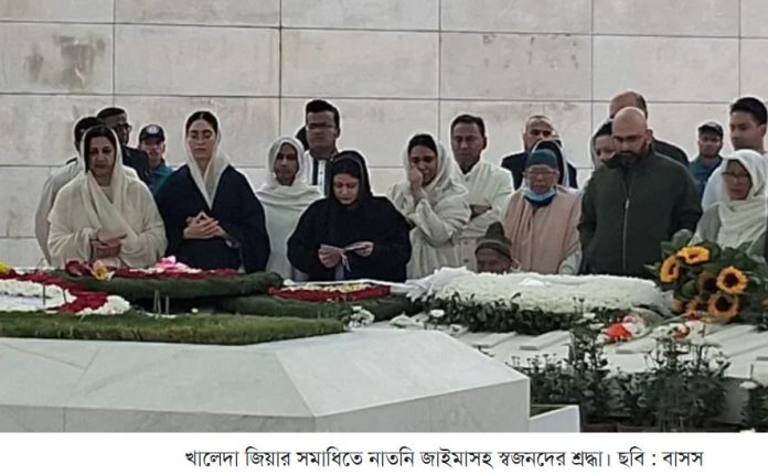 শোকাতুর পরিবেশে পরিবারের সদস্যরা এবং খালেদা জিয়ার নাতনি জাইমা রহমান দাদির কবরের সামনে ফুলের তোড়া রেখে কিছুক্ষণ নিরবে দাঁড়িয়ে থাকেন এবং বিদেহী আত্মার মাগফেরাত কামনায় ফাতেহা পাঠ করেন।